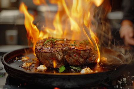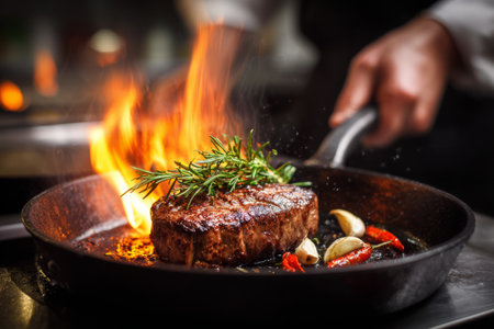 A chef sears a juicy steak with fresh herbs in a hot skillet, flames dancing and creating an exciting atmosphere in the bustling restaurant kitchen during dinner rush.