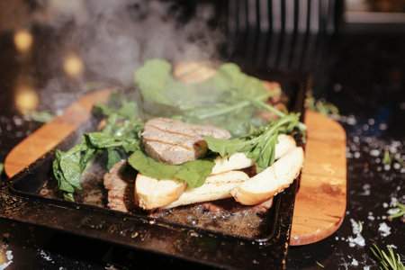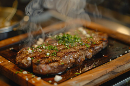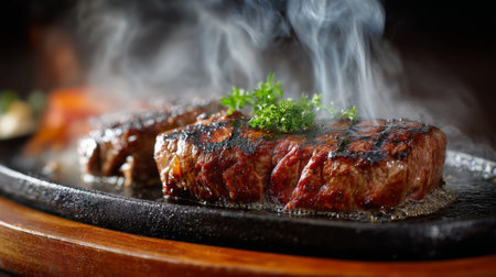 Tender grilled steak is sizzling on a hot stone releasing savory steam and seasoned with spices creating an appetizing experience in a warm restaurant ambiance.