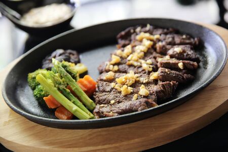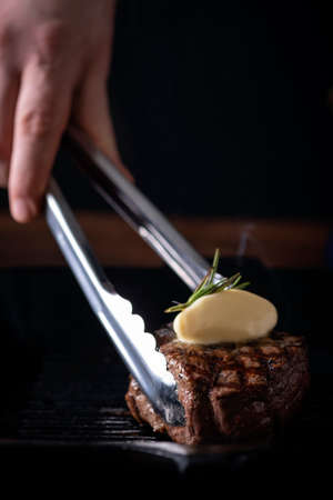 Grilled beef steak with rosemary in black grill pan on the table. High quality photo