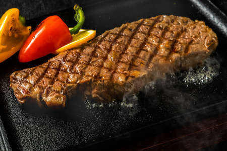 Grilled beef steak cooked on barbecue, closeup on dark wooden table background. Fresh juicy roasted red meat on black stone board, pepper and rosemary. Restaurant food, delicious dish, selective focus