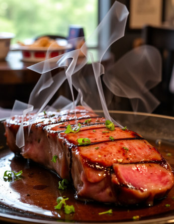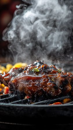 A gourmet grilled steak sizzling on a BBQ grill, surrounded by aromatic smoke, set in a modern restaurant with warm lighting and a vibrant ambiance.