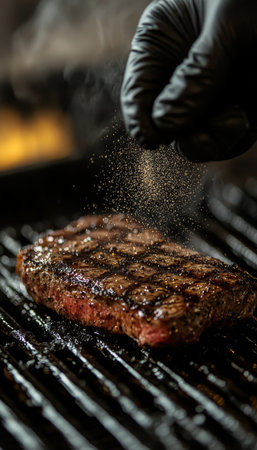 A gloved hand delicately sprinkles seasoning on a perfectly grilled steak for flavor enhancement