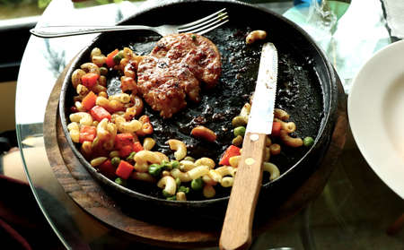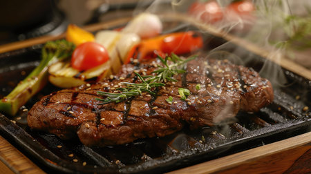 Juicy steak served on a sizzling hot plate with a side of grilled vegetables