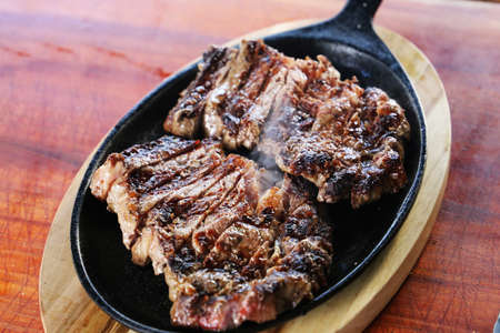Rib Eye. Piece of Ancho steak cut in an iron pan on wooden background.