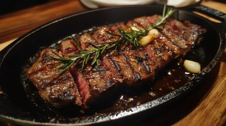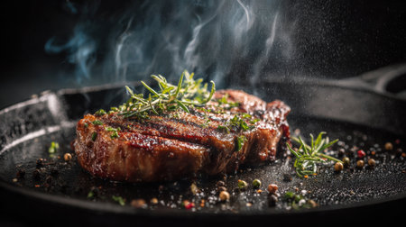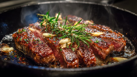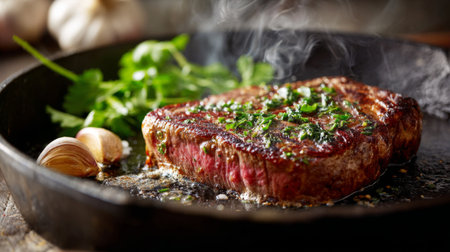 A sizzling steak cooked to perfection, garnished with fresh herbs and garlic, presents a mouthwatering scene in a hot cast iron pan, evoking rich flavors and culinary delight.