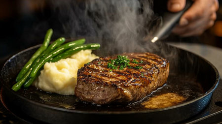 A dynamic shot of a sizzling pork steak being served on a hot skillet, with steam rising and a side of mashed potatoes and green beans.