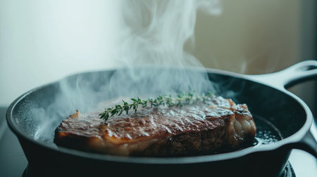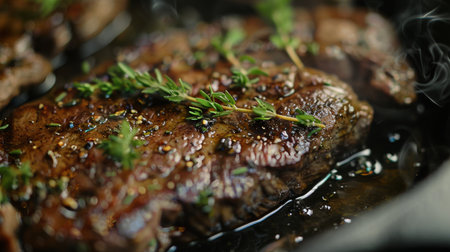 Savor the moment as a juicy steak cooks in a hot pan, releasing aromatic steam. Fresh thyme adds a touch of flavor, creating a culinary delight.