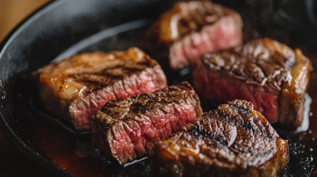 Juicy beef steaks sizzle on a hot grill, releasing flavorful steam. The warm ambiance highlights the mouth-watering cooking process and showcases the chefs skill in preparing a delicious meal.