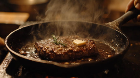 A juicy steak sizzles in a skillet, topped with a pat of butter, releasing a savory aroma and smoke. Perfect for food lovers and culinary enthusiasts.