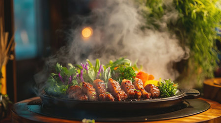 Juicy grilled meat skewers are sizzling on a hot plate sending up wisps of steam. Fresh herbs are placed on top enhancing the rich aroma and flavor of the dish.