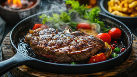 A delicious steak sizzles in a hot pan, surrounded by vibrant vegetables. The steam creates an inviting atmosphere, highlighting the cooking process. Perfect for food lovers.
