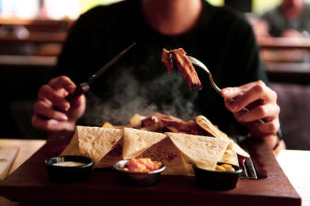 Closeup macro on grilled beef meat with pepper sauce and potato wedges