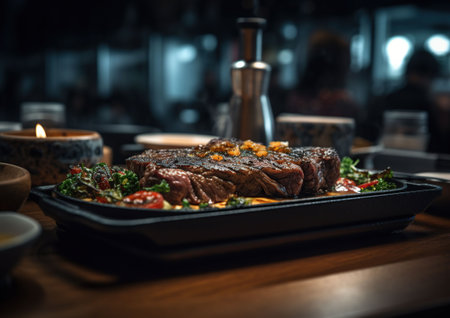 A high-resolution image of a sizzling steak on a hot stone plate, surrounded by colorful side dishes and garnished with herbs and spices, in a stylish restaurant.