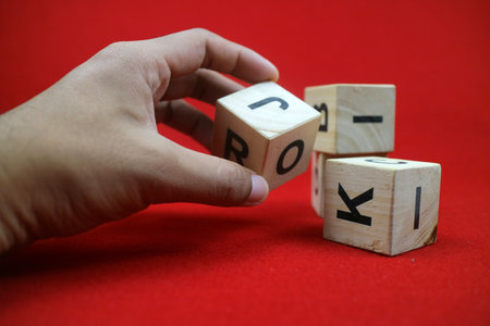 a hand holding Educational stacking cube toy made of wood with numbers and letters. Red background