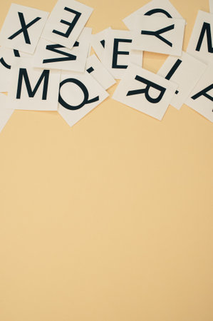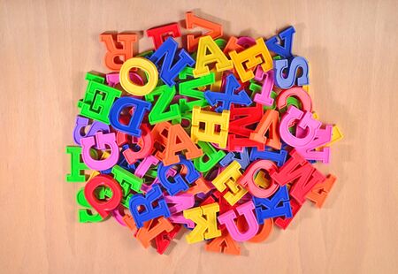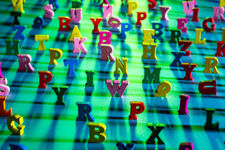 The letters of the English alphabet are placed on the table in any order. The concept of reading books in English. Literacy and education. Latin letters are highlighted from the upper corner.