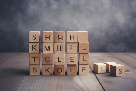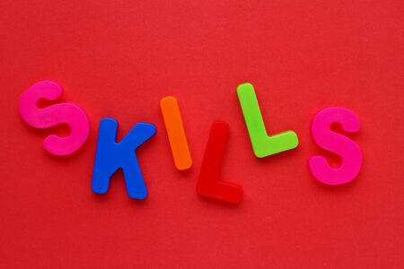 Text made in multicolored magnetic letters. SKILLS. Color paper background