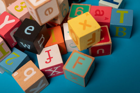 Wooden alphabet letters on blue paper background. A lot of wooden letters with copy space.