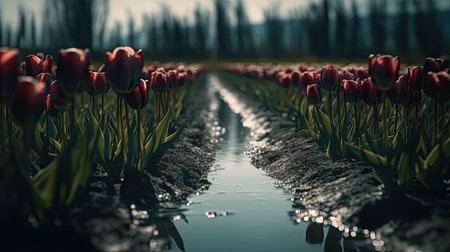 An AI generated illustration of a flourishing meadow coming alive with beautiful colorful tulips, creating a vibrant symphony of life in nature
