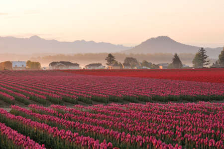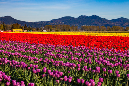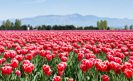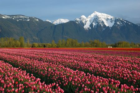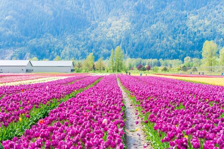Real tulip farm fields with mountain the background, open to tourists at the Chilliwack Tulip Festival in Canada, with real Canadian tulips.