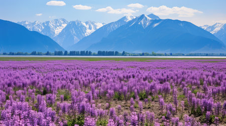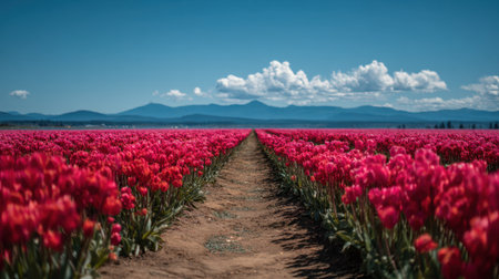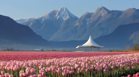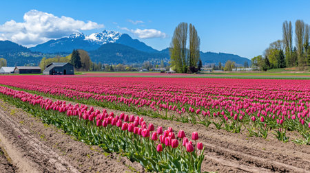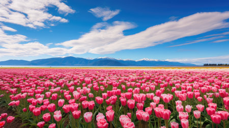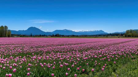A stunning view of vibrant pink tulip fields stretching across the landscape, framed by majestic mountains and a bright blue sky. A perfect spring scene.