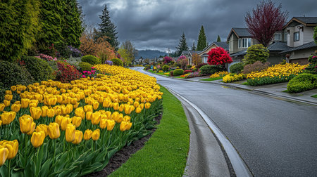 A picturesque neighborhood in spring featuring vibrant yellow tulips and blooming trees set against a cloudy sky, creating a serene atmosphere.
