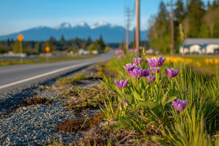 Close-up view of clusters of purple tulips growing along a roadside, with a highway in the background. The tulips are in full bloom, contrasted against the green grass and the gravel of the roadside. The background includes a partly visible town and distant mountains.