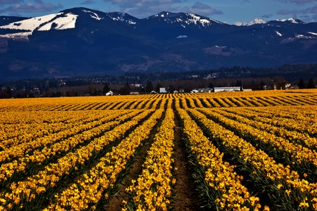 Spring Yellow Daffodil Rows Flowers Snow Mountains Skagit Valley Washington State Pacific Northwest