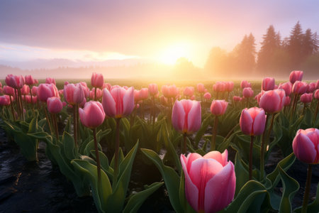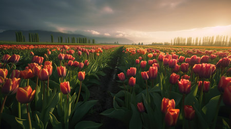 Tulip field in the light of sunset. Beautiful spring landscape. Generative AI