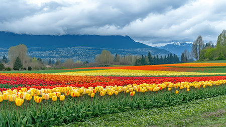 A breathtaking view of vibrant tulip fields in spring, showcasing a stunning array of colors under a cloudy sky. Experience nature