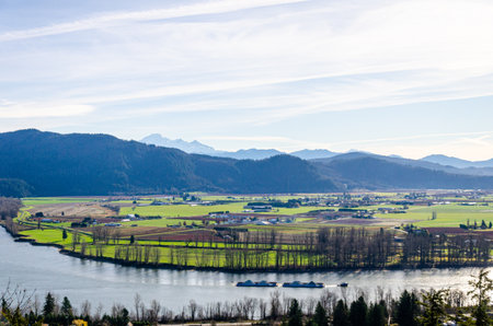 View of the Fraser Valley near Abbotsford BC. Summer in the Fraser Valley. Canadian homestead. Rural agricultural land. The Frazier River is an important salmon habitat for the lower mainland of BC
