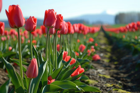 An AI generated illustration of A vibrant row of blooming tulips in a colorful field