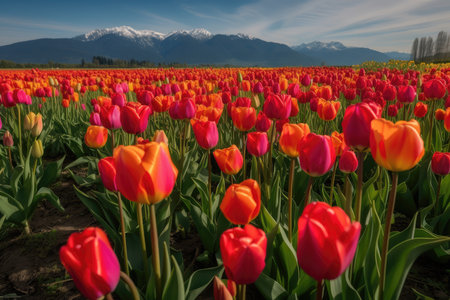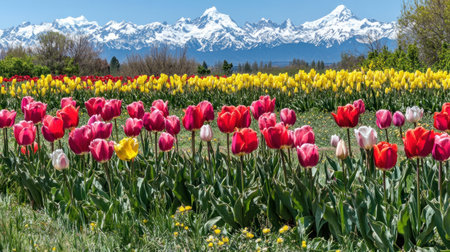 Vibrant rows of tulips create a colorful spectacle, leading towards majestic snow capped mountains under a clear blue sky