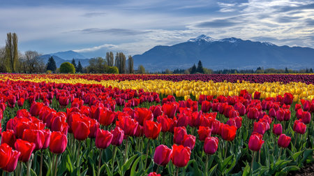 Beautiful tulip fields with snow-capped Andes mountains in the background, captured using a Sony Alpha A7 III and G Master lens for stunning detail and vibrant colors of reds, pinks, yellows, and greens. This image showcases the natural beauty and diversity of nature's palette. --chaos 30 --ar 16:9 --v 6.1 Job ID: abdf05be-af7d-4ba0-af54-3fa9012453e6