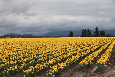 Endless rows of daffodils bloom under a dark, rainy sky in rural Skagit County, Washington.