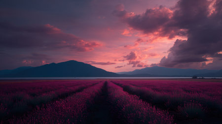 Witness a stunning lavender field illuminated by a vibrant sunset, with dramatic clouds and a mountain range creating a serene landscape full of natural beauty and tranquility.