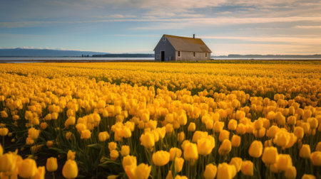 tulip field in full bloom, with a wooden cabin and lake in the background, created with generative ai