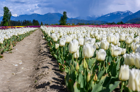 Rows of vibrant white tulips flourish under a clear sky with distant mountains. This floral landscape captures the beauty of spring in a serene location.