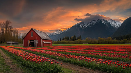 A stunning view of a red barn set against a backdrop of vibrant tulip fields, with a dramatic sunset illuminating snow-capped mountains in a rural landscape.