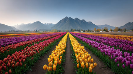 Expansive field of tulips in vibrant colors stretches towards distant mountains under a clear sky, showing natural beauty and tranquility