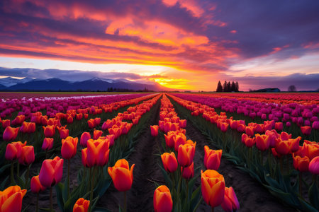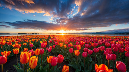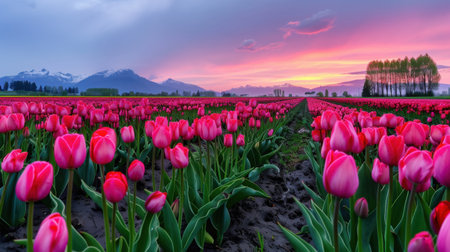A picturesque view of a vibrant tulip field at sunset, showcasing bright red flowers against a stunning twilight sky, embodying seasonal beauty and tranquility.