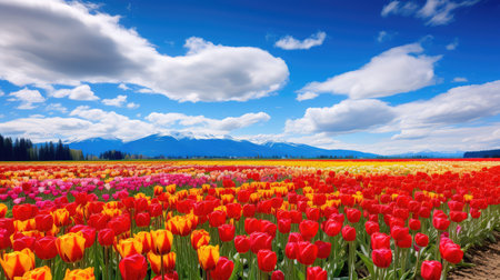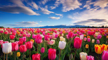 A stunning view of vibrant tulip fields blooming in various colors under a bright blue sky, surrounded by majestic mountains and fluffy clouds. Perfect for spring-themed projects.