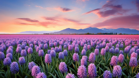 purple hyacinths bloom in the countryside at sunset, showcasing the mesmerizing optical illusions created by the light red and sky-blue hues. this photo, inspired by the vancouver school and national geographic style, captures impressive panoramas that resemble photo-realistic landscapes. the vibrant colors and delicate flowers create a stunning visual experience, reminiscent of the mote kei aesthetic. ai generated