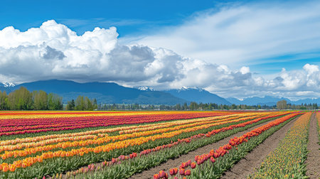 A stunning view of vibrant tulip fields showcasing various colors. The clear blue sky features fluffy clouds above a picturesque mountain backdrop. A perfect spring landscape.