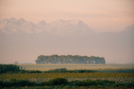 Scenic landscape showcasing mountains and a grove of trees at sunset