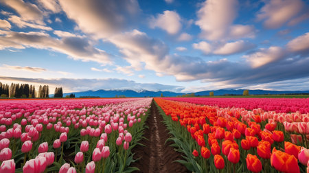 A stunning view of a vibrant tulip field showcasing brilliant colors under a dramatic sky with fluffy clouds and looming mountains, evoking a sense of peace and beauty.