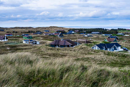 Wooden colorful weekend houses on the Rømø island in Denmark under the cloudy sky with the marram grass in the foreground during the autumn day