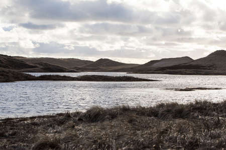 Sand dunes on the island of Amrum in spring on a cloudy, atmospheric day at low tide. Idyllic picturesque landscape with dry grass.
