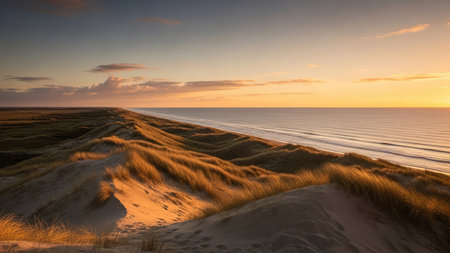 sunlight over sand dunes and stormy sea, Noordwijk, Holland