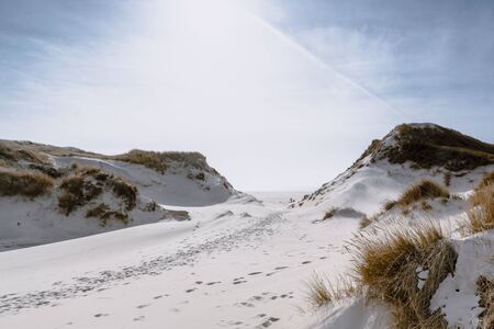 White sand dunes and dry grass on the shore with footprints on surface. Low angle landscape with bright cloudy sky at North Sea coast