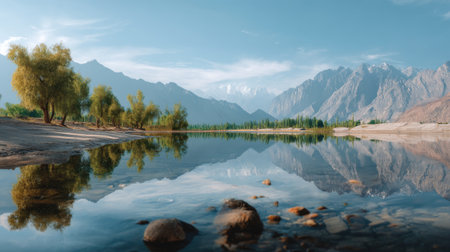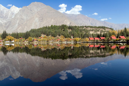 Scenic lake reflecting mountains and autumn trees at Lower Kachura Lake, also known as Shangrila Lake, is a lake located near the city of Skardu in Gilgit-Baltistan, Pakistan.